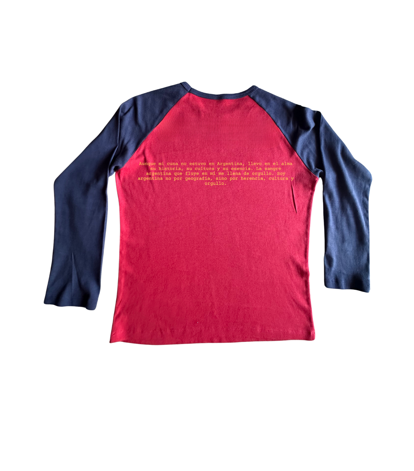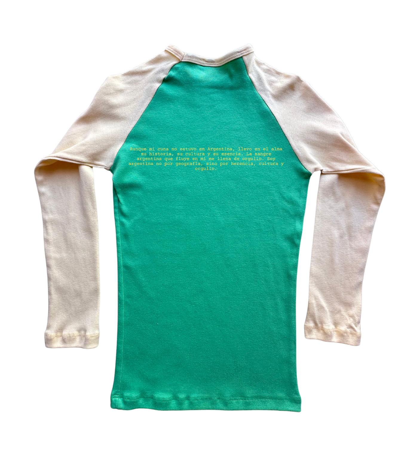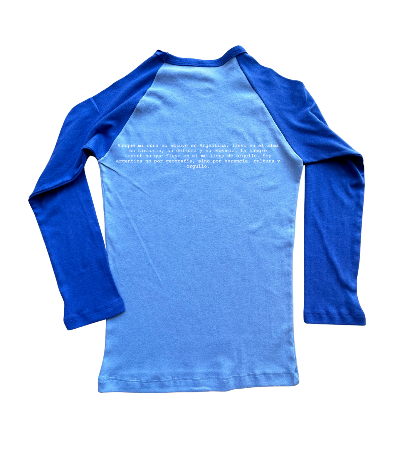 This full length baby tee features contrasting raglan sleeves and a thin binding finish around the neck.