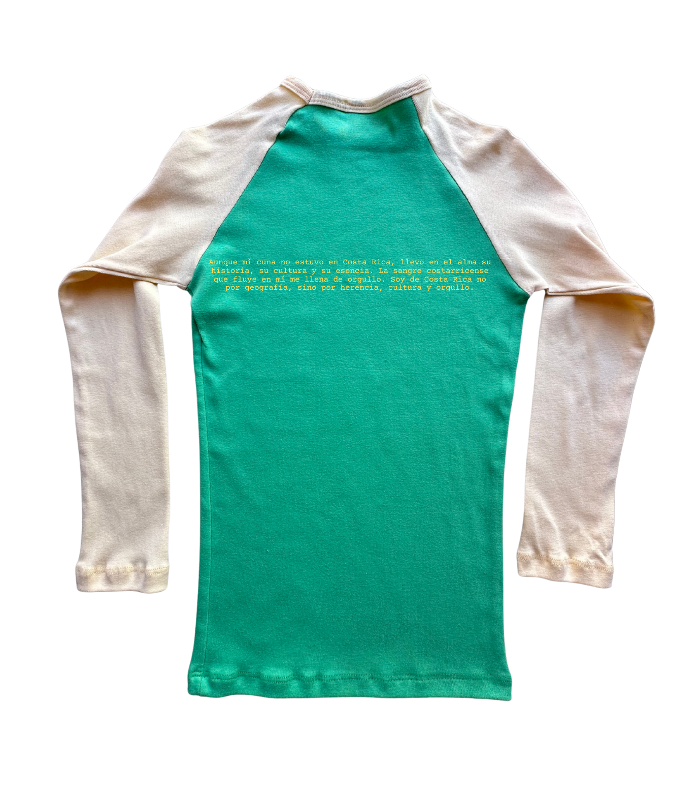 This full length baby tee features contrasting raglan sleeves and a thin binding finish around the neck.